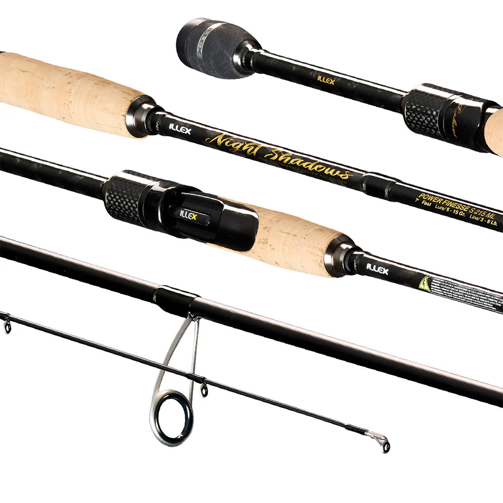 Die ILLEX Night Shadows Rutenserie wurde speziell für das Angeln im Süßwasser entwickelt. Sie ist das Ergebnis der Zusammenarbeit des europäischen ILLEX-Teams mit den Produktmanagern und bringt japanische Technologie und die Bedürfnisse europäischer Angler auf einen Nenner. Kein Wunder, dass diese Rutenserie einen exzellenten Ruf genießt. Diese Ruten der Spitzenklasse basieren auf einem Blank aus feinsten Toray Carbon Matten und sind mit sehr hochwertigen Komponenten versehen. Die Beringung besteht aus verwicklungsfreien Fuji K-Alconite Ringen, welche ein Vertüddeln der Schnur um die Ringe beim Werfen zuverlässig verhindern und die Wurfperformance der Ruten herausragend unterstützt. Der VSS Rollenhalter ist ebenfalls vom japanischen Hersteller Fuji und bietet der Rolle den perfekten Halt und dem Angler einen äußerst angenehmen Grip. Dazu trägt auch die Griffgestaltung des Split Grips bei, wo edler portugiesischer Kork das obere Griffstück bildet und hochdichter EVA-Schaum das Endstück. Das sieht genauso gut aus wie es sich anfühlt. Die ILLEX Night Shadows Spinnruten haben ein edles Design, welches perfekt zur Performance passt. Diese Ruten überzeugen optisch genauso wie in der Praxis und werden in einem edlen Futteral geliefert.