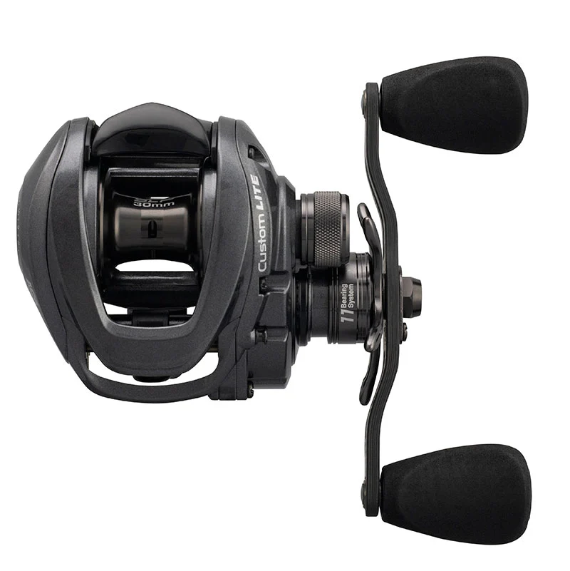 Darüber hinaus ist die kleine Baitcasterrolle vollgepackt mit erstklassigen Komponenten und einem Premium 11-Kugellagersystem mit doppelt abgeschirmten Edelstahlkugellagern. Die Custom Lite SLP Rolle verfügt über eine extern einstellbare 6-stufige Quiet-Cast-ACB System (Adjustable Centrifugal Braking) mit 27 Positionen. Das Spulengewicht der 30 Millimeter-Spule beträgt inkl. Lager unter 10 Gramm. Damit befördert die Custom Lite auch leichteste Köder weit und präzise ins Ziel. Unterm Strich kann man die Custom Lite SLP schon fast als BFS-Rolle bezeichnen.