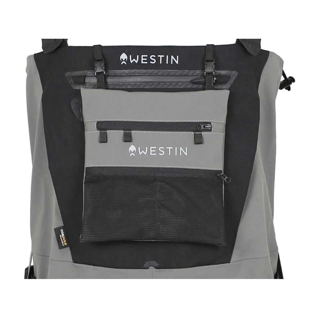 Um dir auch auf deinen Touren durch die verschiedensten Gewässer Platz für die wichtigsten Utensilien zu bieten, ist die Westin W8 St. Foot (Dark Shadow) mit kleinen aber praktischen Taschen und mehr ausgestattet. Hier findest du zunächst die Brusttasche aus Cordura-Gewebe, welche mit einem wasserdichten YKK Reißverschluss ausgestattet ist und Platz für deine Angelpapiere oder ähnliches bietet. Doch das eigentliche Highlight ist die ausklappbare Brusttasche. Diese kannst du bei Bedarf nach Innen oder Außen klappen oder sogar ganz abnehmen. Sie bietet ein Hauptfach und zwei kleine Netztaschen. Für kleinere Werkzeuge wie z.B. Lösezangen ist ein Holster aus Gummi auf der Brust befestigt. Sollten deine Hände doch einmal zu kalt sein, dann bietet die mit Fleece gefütterte Handwärmtasche die nötige Abhilfe.
